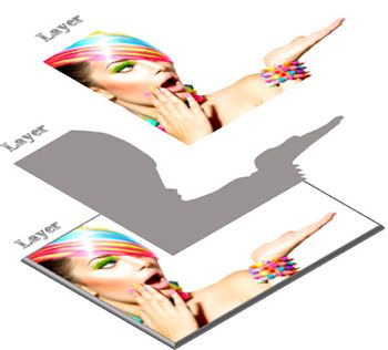 В стандартной комплектации доступна конфигурация печатающих головок, при которой получается сразу наносить три слоя для двухсторонней печати на прозрачных материалах – цветное изображение, промежуточный белый слой и кроющее цветное изображение.